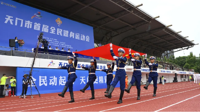 8时许,开幕式开始。伴随着高昂的旋律,鲜艳的五星红旗被高擎着举入会场,紧随其后的是天门市全民健身运动会会旗。
