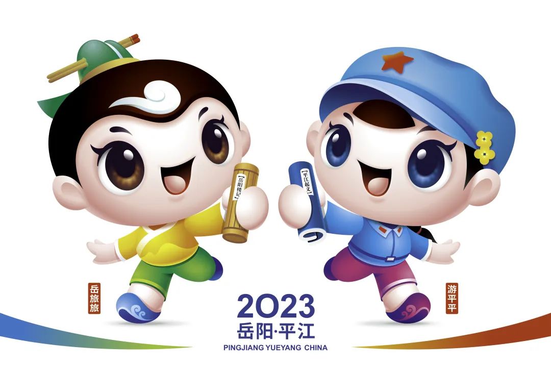 设计说明:第二届岳阳市旅游发展大会卡通吉祥物形象“岳岳/平平”的设计造型以“红军小女孩/将军之乡、少年屈原/屈原文化、诗词书卷/诗词之乡/岳阳楼记、筷子/十大碗/美食文化、书本/平江起义、绽放桂花/地域特产、五星/红色文化、幕阜山、石牛寨、仙姑崖、汨罗江、行云流水、青山绿水、吉祥纹样、活力欢迎、微笑点赞”等元素为创意构思点,通过艺术拟人化处理结合中国吉祥娃娃的特性,塑造出活泼可爱、活力十足的卡通形象,体现岳阳平江城市深厚的历史文化底蕴以及旅游发展特点。 “岳岳/平平”阳光亲和、自然活力,向前奔跑、微笑健康、充满勃勃生机,做出欢迎的姿势,寓意欢迎各界游客亲临生态山水、独具魅力的岳阳平江县,传达出平江县丰厚的历史文化底蕴和丰富的旅游文化资源,展现“一江山水诗城、两岸百里画廊"的旅游内涵,彰显出第二届岳阳市旅游发展大会建设事业无限美好的发展前程。卡通吉祥物形象整体造型简洁活力,富有亲和力与感染力,便于后续延续与文创产品开发。