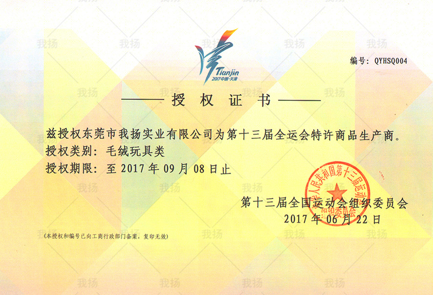 为了让吉祥物公仔为本次全运会增添光彩,我扬团队利用多年运营大型赛事吉祥物的经验,经过多次评审、修改吉祥物公仔及优化设计吉祥物公仔印花稿,终于呈现给了本届运动会组委会一个满意的作品。经过本届运动会组委会评审专家的严格评审最终选定我扬成为中华人民共和国第十三届运动会毛绒玩具类特许生产商、零售商。