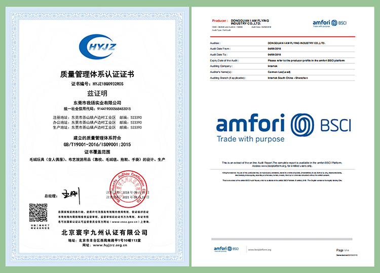 近日,公司获得了质量管理体系认证和商业社会标准认证两大证书。经过国家及国际权威机构质量认证中心专家组的全面、严格、细致的审核,公司质量管理体系符合GB/T19001-2016/ISO 9001:2015标准;公司社会责任管理体系符合BSCI标准。证书覆盖范围:毛绒玩具(吉祥物)、布艺旅游用品、设计、生产。